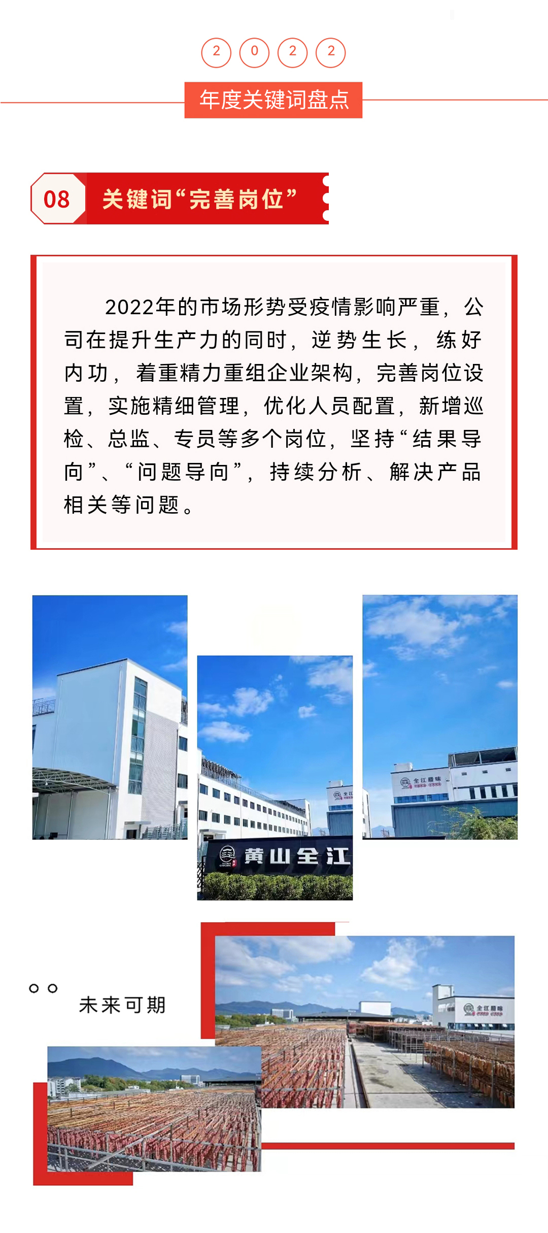 四季更替,光陰荏苒,細數(shù)2022年的歷程,“疫情”一詞繼續(xù)刷了一整年的屏。黃山全江公司面臨一系列的市場行情壓力,從容面對與克服。此刻,盤點著舊年的年度關鍵詞,濃縮著黃山全江臘味砥礪奮斗的2022,記錄著這一年的收獲和成果,也規(guī)劃著新一年的追求與向往。