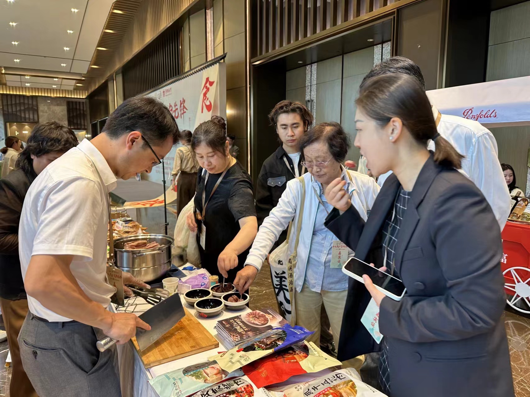 在“良辰美集”美食展覽環(huán)節(jié),全江市場部經(jīng)理羅輝為來往食客烹飪臘味美食,講解公司創(chuàng)制歷史,企業(yè)文化?;罩莸栋逑恪⒒张舍u鴨、醬香黑豬肉、農(nóng)家土香腸……琳瑯滿目的特色臘味產(chǎn)品吸引不少食客駐足品嘗,各位美食愛好者們贊不絕口,紛紛豎起大拇指!