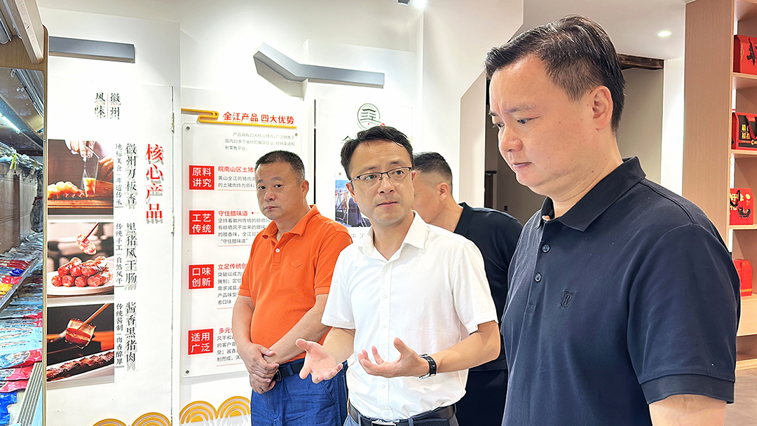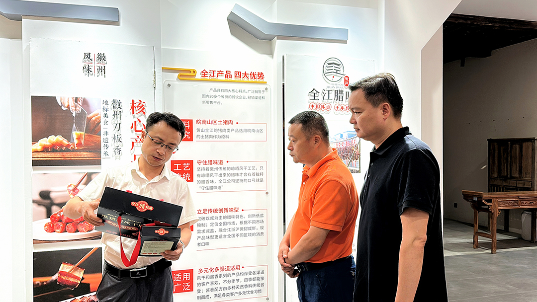 7月12日,全江臘味迎來了江蘇溧陽姜下村委呂崗華書記一行的到訪。市場部經(jīng)理羅輝攜同相關(guān)人員全程接待。